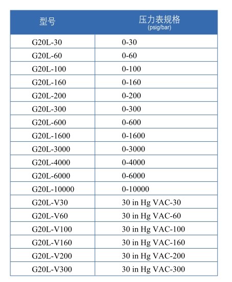 G20系列壓力表主要使用于減壓器及管路系統(tǒng)壓力顯示,壓力表規(guī)格為2",進氣螺紋為1/4"NPT,壓力表精度為2.5級,3-2-3 %。材質:316L(與介質接觸部分)